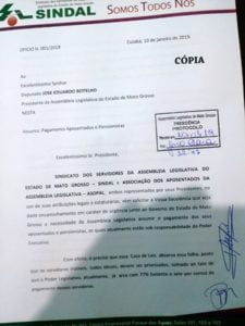 O SINDAL juntamente com a Associação dos Aposentados e Pensionistas da Assembleia Legislativa de Mato Grosso reiterou o pedido de urgência à Mesa Diretora da Casa de Leis, que obriga o legislativo a assumir em cem por cento, o pagamento dos salários dos aposentados e pensionistas. Os pagamentos têm sido feitos pelo governo do Estado há mais de dez anos por decisões de gestões anteriores.