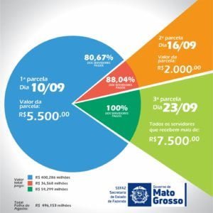 As duas parcelas restantes serão pagas nos dias 16 e 23 de setembro. No dia 16 serão depositados até R$ 2 mil, completando 88,04% da folha. Naquela data será depositado um total de R$ 36,5 milhões.