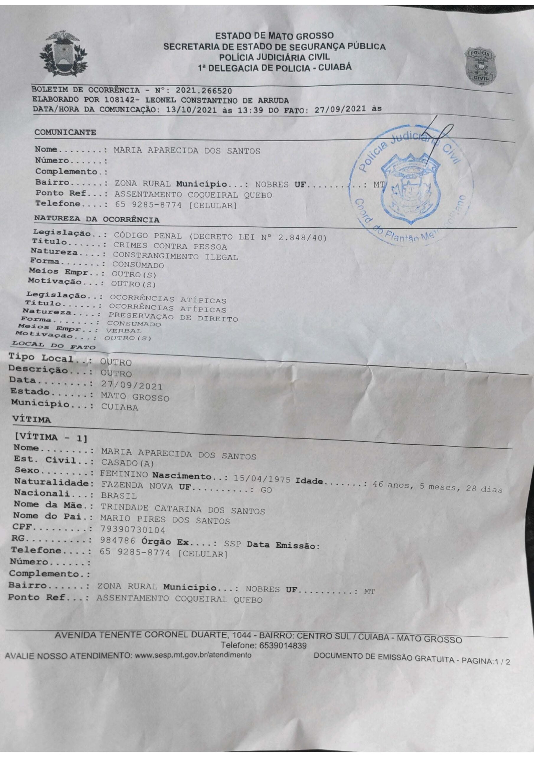 Diante disso, Maria Santos registrou Boletim de Ocorrência n° 2021266520, com queixa-crime de constrangimento ilegal previsto no Código Penal decreto lei nº 2.848/40, contra Edneia Campos e onde espera uma retratação pública pela falta de respeito e constrangimento público que a assentada sofreu.