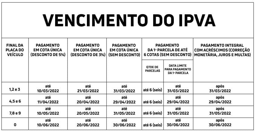 De acordo com o novo calendário do IPVA, relativo ao exercício de 2022, o vencimento terá início em março e encerra no mês de junho, conforme o final da placa do veículo. Em um cenário normal, o imposto seria cobrado no período de janeiro a junho. Dessa forma, as placas de finais 1, 2 e 3 vencem no mês de março; as placas de finais 4, 5 e 6 vencem em abril; as placas de finais 7, 8 e 9 vencem no mês de maio; e as placas de finais 0 vencem em junho.