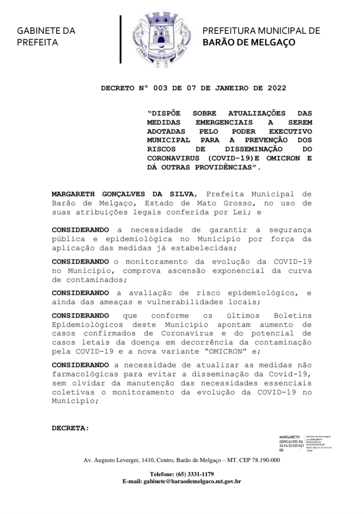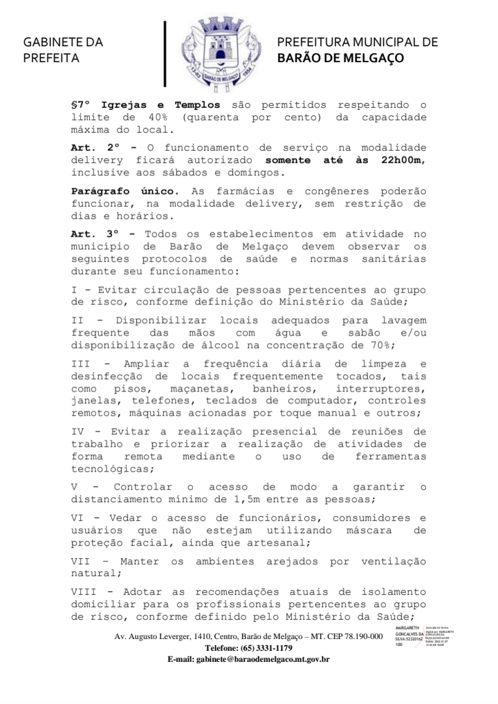 A prefeitura de Barão de Melgaço decretou toque de recolher e protocolos de prevenção aglomerações e distanciamento. Além de proibir qualquer tipo de eventos públicos e particulares com presença massiva de pessoas e o uso de mascaras, nas ruas e estabelecimentos públicos e privados. As decisões foram publicadas em diário oficial desde a última sexta-feira (7).