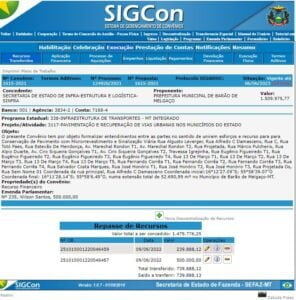 Conforme o extrato de repasses da Secretaria de Infraestrutura do governo de Mato Grosso (SINFRA), a prefeitura de Barão de Melgaço assinou convênio com a Sinfra no valor de R$ 1.509.975,77. No entanto, o valor concedido pelo órgão foi de R$ 1.479.776,25. Desse total, a Sinfra repassou para a prefeitura no dia 9 de junho de 2022, R$ 739.888,13, que incluiu valor de 500 mil de uma emenda parlamentar do deputado estadual Wilson Santos. O restante, R$ 738.408,88 esta assegurados para o dia 6 de junho de 2023.