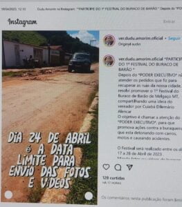 O vereador Eduardo Amorim, o Dudu Amorim de Barão de Melgaço vai pagar 40 litros de combustível para o vencedor do “ 1º Festival de Buracos de Barão” da cidade, promovido por ele, numa forma de críticas a demora da prefeitura, para ao menos, tapar a grande quantidade de buracos, no centro do município. O vereador fez o anúncio no seu Instagram @ver.dudu.amorim.oficial nesta terça-feira (18). O festival está com inscrições abertas desde ontem (17) e vai até o próximo dia 28 de abril. As fotos ou vídeos devem ser enviados neste WhatsApp (65) 99611-6163. “Vou pagar 40 litros de combustível do meu bolso para o vencedor do 1º festival dos buracos de Barão”, garantiu o vereador, que se inspirou na iniciativa do vereador cuiabano, Dilemário Alencar (PSB), ao mostrar nas redes sociais, a situação do asfalto na capital.