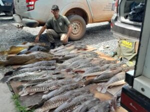 Durante patrulhamento terrestre próximo à comunidade Mangueiral, em Várzea Grande, os agentes da fiscalização da Fauna, com o apoio da Polícia Militar, encontraram 356,670 kg de pescado ilegal das espécies pintado, cachara e jaú, no interior de um veículo.
