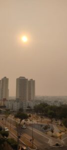 Cuiabá está encoberta por fumaça que impediu o Sol brilhar na manhã desta quinta-feira (5). Tempo muito seco tem contribuído para as queimadas na área urbana e rural da cidade concentrando a fumaça densa por quase todo o dia.