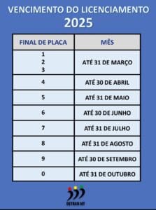 O Governo de Mato Grosso divulgou no Diário Oficial do Estado, o calendário de pagamento do Licenciamento Anual do Veículo para o ano de 2025, estabelecido pelo Departamento Estadual de Trânsito (Detran). Os proprietários de veículos com placas terminadas nos números 1, 2 e 3 devem efetuar o pagamento do Licenciamento 2025 até o dia 31 de março. Para veículos com placa final 4, o pagamento será em abril; final 5, em maio; final 6, em junho; final 7, em julho; final 8, em agosto; final 9, em setembro; e final 0 em outubro.