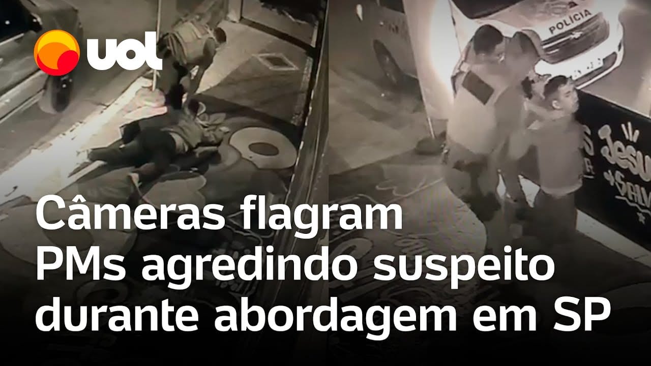 Câmeras de segurança flagraram o momento em que dois policiais militares agridem um suspeito de tráfico de drogas em Rio Claro (SP). Os agentes não usavam câmeras corporais.