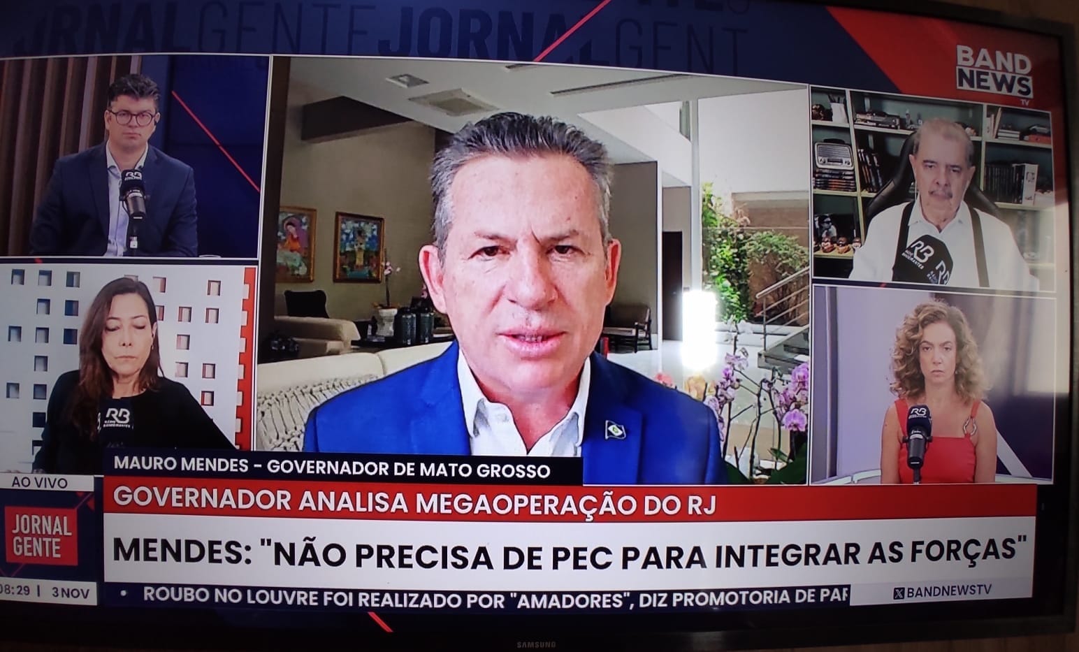 Em entrevista para a Rádio e TV Band News, na manhã desta terça-feira (3), em São Paulo, o governador de Mato Grosso, Mauro Mendes (União Brasil), voltou a defender a megaoperação no Rio de Janeiro e criticar a legislação brasileira, no combate à criminalidade, em especial, aos grupos de facções, que dominam o país. Ele rejeitou a proposta de aprovação de uma Proposta de Emenda à Constituição, para integrar as forças de segurança dos Estados, ao governo federal e disse que, a megaoperação serve de exemplo aos demais estados.