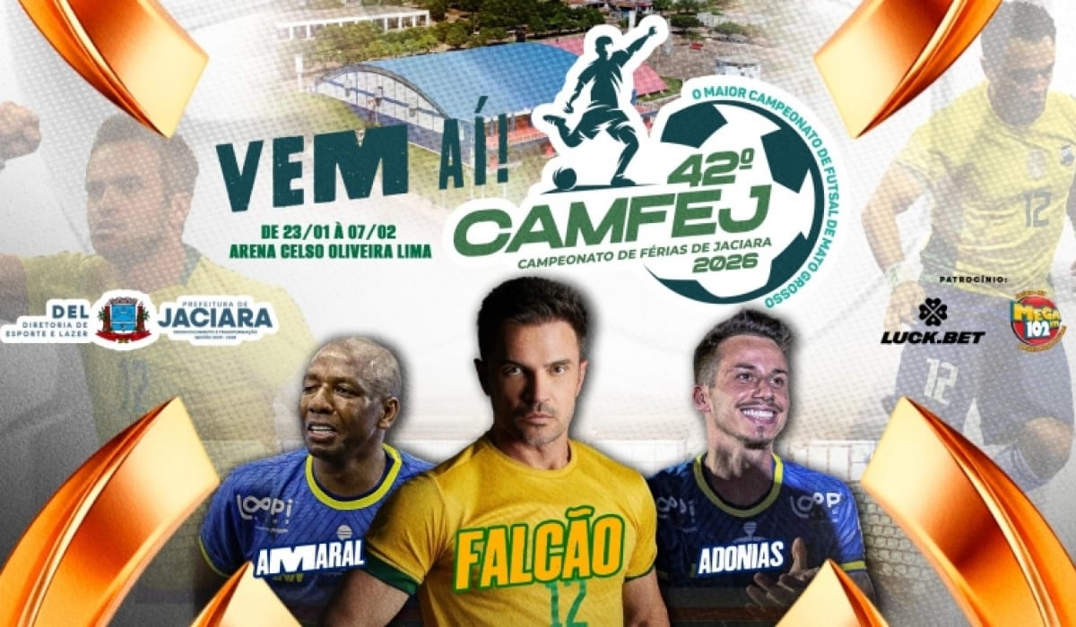 Jaciara já vive o clima de um dos maiores eventos esportivos do estado. A cidade se prepara para a 42ª edição do Campeonato de Férias de Jaciara (CAMFEJ 2026), que promete entrar para a história com recorde de premiações, a estreia da moderna Arena Celso Oliveira Lima, o “Celsão”, e a presença ilustre do maior nome do futsal brasileiro: Falcão.