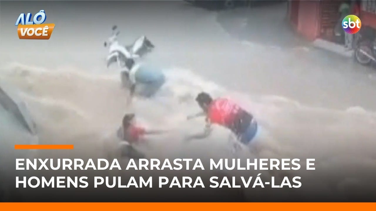 Duas mulheres foram arrastadas por uma enxurrada enquanto estavam em uma moto, em Montes Claros (MG). A força da água levou vítimas e veículo. Dois homens que aguardavam a chuva em uma mercearia pularam na correnteza para socorrê-las. Outro ajudou a recuperar a moto. Saiba todos os detalhes no Alô, Você.