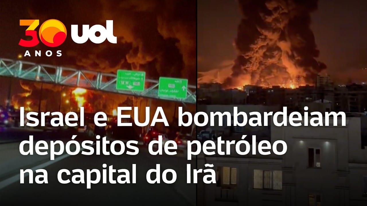 Israel e Estados Unidos atacaram depósitos de petróleo em Teerã e proximidades entre a noite de sábado (7) e a madrugada de domingo (8). Vídeos gravados pela população mostram ruas da capital em chamas e fumaça densa.