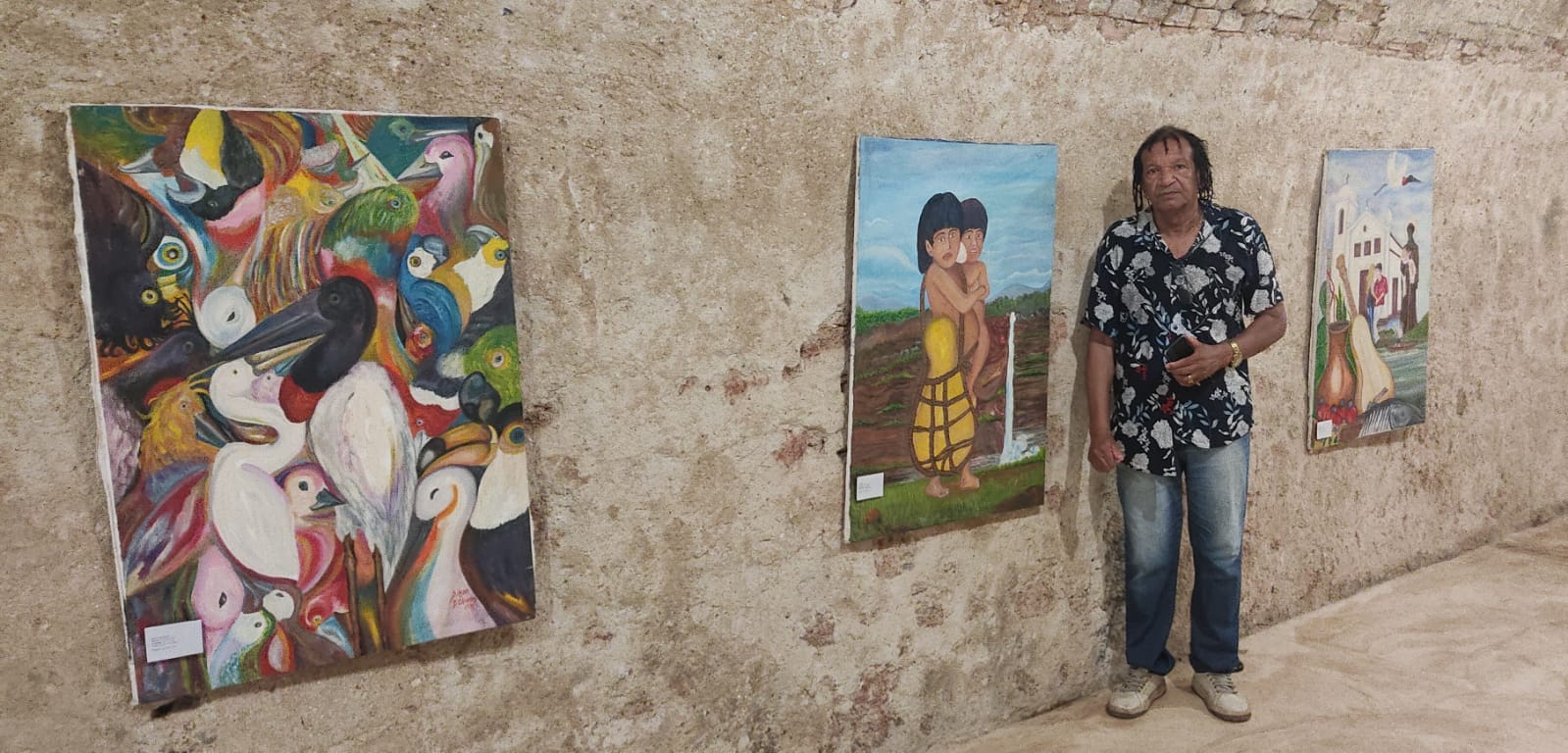 O artista Dilson de Oliveira, que também é músico e compositor renomado do rasqueado cuiabano, expõe telas que definem seu trabalho como um retrato da identidade cuiabana, reunindo elementos como religiosidade, cultura e tradições.