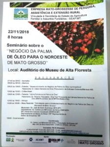 A troca de experiências e investimentos futuros na agricultura familiar na região norte de Mato Grosso fortaleceram as perspectivas de negócios no Seminário “Negócio da Palma de Óleo para o Noroeste de Mato Grosso”, num evento que aconteceu no dia 22, nas dependências do Auditório Museu em Floresta (a 820 quilômetros de Cuiabá). O objetivo foi debater o desenvolvimento do mercado do óleo da palma na região Amazônica mato-grossense.