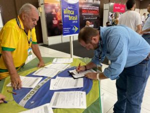O Aliança Pelo Brasil está em plena atividade para atingir a meta de mais de 30 mil assinaturas em Mato Grosso, essenciais para serem somados aos mais de 500 mil assinaturas, que a futura sigla precisa para ser reconhecida pelo Tribunal Superior Eleitoral (TSE), nas eleições municipais deste ano. Nesta terça-feira (4), a sigla colheu assinaturas, durante o evento, “Boi que Deixa Dinheiro”, realizado pela Silveira Consultoria e Gestão Pecuária, no Hotel Fazenda Mato Grosso, em Cuiabá. Mas os voluntários colhem assinaturas todos os dias no período de 10 horas às 17 horas em diversos pontos da cidade.