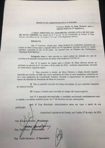 A Assembleia Legislativa de Mato Grosso agendou para 10 de junho a eleição da Mesa Diretora para o biênio 2021/2023. A decisão foi anunciada hoje (7), durante a divulgação de uma resolução administrativa que definiu o cronograma para a eleição interna. Sem concorrente ao cargo de presidente, o deputado Eduardo Botelho (DEM) deverá ser reconduzido ao posto. E a deputada Janaína Riva (MDB) disputa a primeira-secretaria, o atual secretário, deputado Max Russi (PSB).