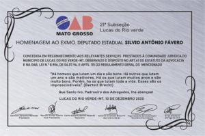Silvio afirmou estar lisonjeado pelo reconhecimento da sua atuação em defesa da classe dos advogados de Lucas do rio Verde, onde figura como um dos primeiros profissionais do direito atuante no município. “Dia de comemorar ao lado da OAB/MT e OAB de Lucas Do Rio Verde, as futuras instalações da 21ª Subseção. Agradeço a todos pelas palavras e referência de ser o deputado da advocacia. Continuarei trabalhando com muito orgulho e dedicação a favor da categoria! Orgulho de ser um dos primeiros advogados dessa terra de gente batalhadora!”, concluiu o deputado, em post na suas redes sociais.